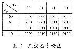 兩位乘法器能夠實現2位二進制數的乘法運算,設A1A0,B1B0為乘數和被乘數,P3P2P1P0為乘法運算得到的積,由卡諾圖(見圖2)得到兩位乘法器的輸出邏輯函數表達式分別為: