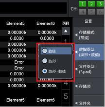 第三,數(shù)據(jù)類型里有“數(shù)值”、“波形”、“數(shù)值+波形”三個(gè)選項(xiàng),代表存儲(chǔ)的數(shù)據(jù)類型,點(diǎn)擊“數(shù)值”則表示只記錄數(shù)值數(shù)據(jù),點(diǎn)擊“波形”則表示只記錄波形數(shù)據(jù),點(diǎn)擊“數(shù)值+波形”則同時(shí)記錄數(shù)值和波形數(shù)據(jù);