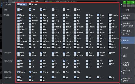 第五,存儲(chǔ)項(xiàng)是設(shè)置中最關(guān)鍵的一步,點(diǎn)開存儲(chǔ)項(xiàng)菜單后,會(huì)看到功率分析儀所能分析記錄的所有數(shù)據(jù),我們根據(jù)自己的需要進(jìn)行勾選對(duì)應(yīng)通道和參數(shù),只有完成存儲(chǔ)項(xiàng)的設(shè)置,才能記錄對(duì)應(yīng)的數(shù)據(jù);