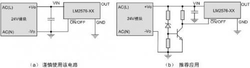 因此推薦使用電路(b),外置簡單的欠壓鎖定,使24V模塊輸出電壓建立到預置值后再啟動LM2576等外接開關電源芯片,可以很大程度上避免啟動不良問題。