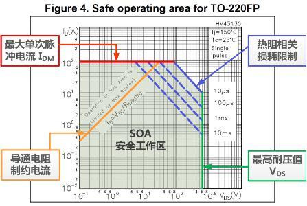 安全工作區:SOA(Safe operating area)是由一系列(電壓,電流)坐標點形成的一個二維區域,開關器件正常工作時的電壓和電流都不會超過該區域。簡單的講,只要器件工作在SOA區域內就是安全的,超過這個區域就存在危險。